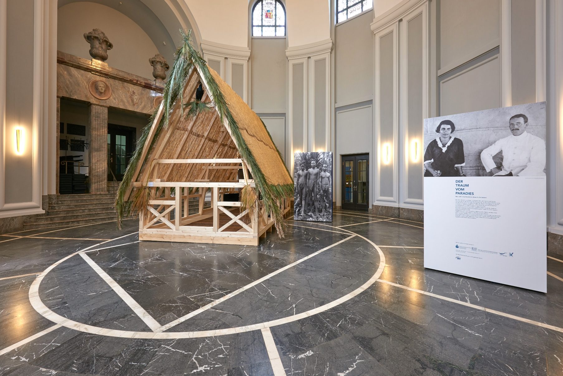 Einen ebenso stimmungsvollen wie beeindruckenden Auftakt in die Ausstellung ermöglicht der Nachbau eines begehbares „Bai“, ein für Palau ortstypisches Haus. In der palauischen Kultur war es bis ins 20. Jahrhundert hinein üblich, die hölzernen Giebel und Querbalken der bis zu 30 Meter langen Häuser mit Figurenfriesen zu verzieren. Diese geben Szenen des Alltags wieder oder einen Einblick in die Glaubenswelt der einheimischen Bevölkerung. Die Faszination darüber war bei Max Pechstein so groß, dass er die bemalten Hausbalken als Grund für die Reise nach Palau angab – dieser Balken, den Max Pechstein schon um 1910 im Völkerkundemuseum in Dresden gesehen hatte, ist in der Ausstellung im Original zu sehen.