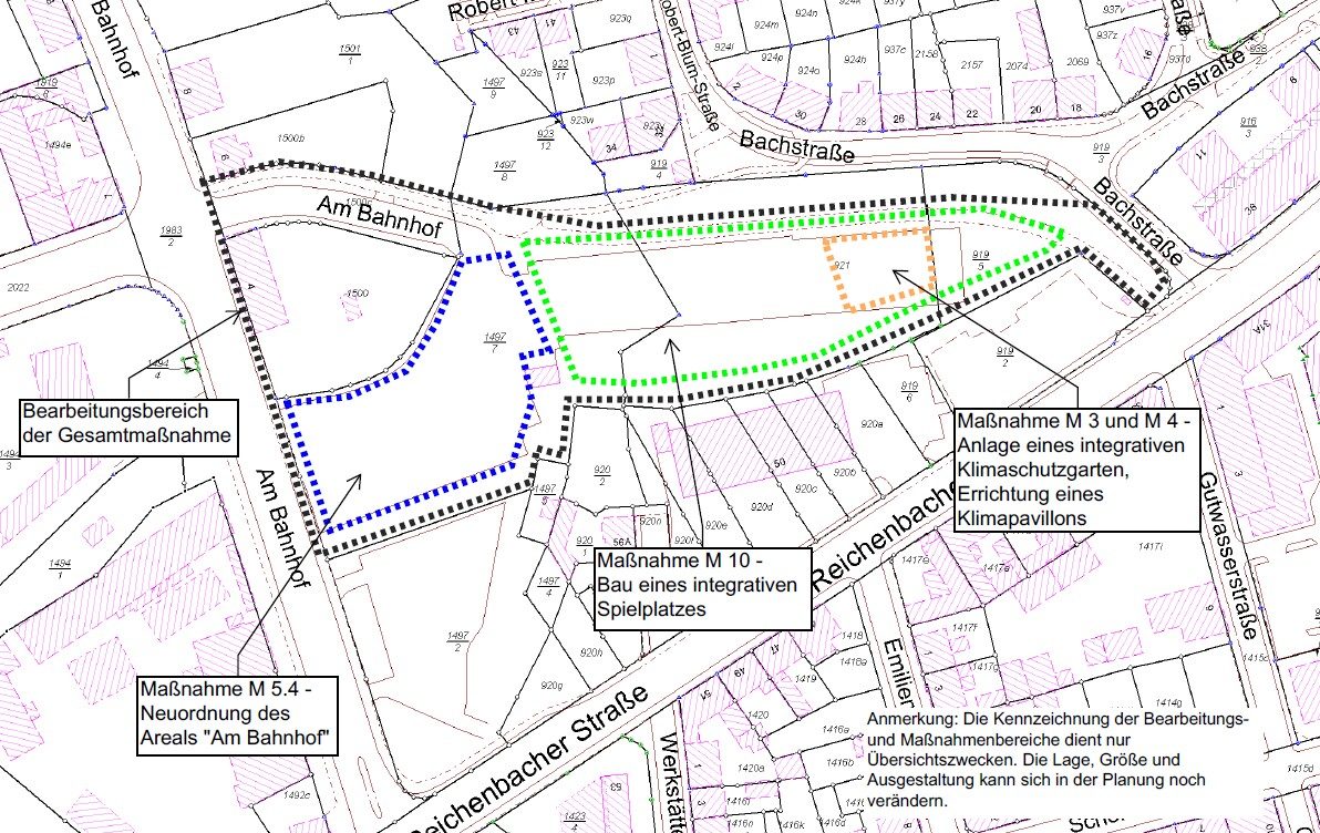 Die Aufwertung des Areals am Bahnhof besteht aus vier Teilen: Der Neuordnung einer Fläche an der Straße „Am Bahnhof“, dem Bau eines integrativen Spielplatzes, der Anlage eines integrativen Klimaschutzgartens sowie der Errichtung eines Klimapavillons. Hauptbestandteil ist der Spielplatz, der auf einer Fläche von ca. 5.000 m² unter Beteiligung der Bürger angelegt werden soll. Der neue Klimagarten soll schließlich von den Bürgern bewirtschaftet werden. Die Gesamtkosten für das Projekt gibt das Garten- und Friedhofsamt mit 815.000 Euro an. Darin ist eine Förderung über das EFRE-Programm in Höhe von 80% enthalten. Die Realisierung soll bis 2019 erfolgen.