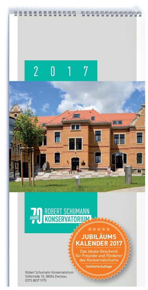 Das Robert Schumann Konservatorium der Stadt Zwickau feiert im kommenden Jahr sein 70-jähriges Bestehen. Anlässlich des Jubiläums ist nun ein Festkalender erschienen. Die Motive zeigen Schüler und verschiedene Ensembles im Unterricht und beim gemeinsamen Musizieren. Der Kalender bietet damit einen Querschnitt der Arbeit an der Musikschule.