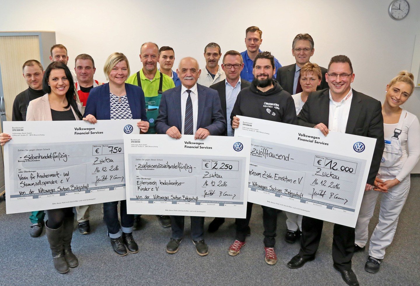 Betriebsrat und Geschäftsführung der Volkswagen Sachsen GmbH haben kurz vor Weihnachten Spenden an drei gemeinnützige Vereine übergeben. 15.000 Euro wurden am Freitag dem Zwickauer Verein „Gemeinsam Ziele Erreichen e.V.“, dem „Elternverein krebskranker Kinder e.V. Chemnitz“ und dem „Verein für Knochenmark- und Stammzellspenden“ überreicht. Dabei wurden 12.775 Euro durch die Belegschaft gesammelt und von VW Sachsen aufgestockt.