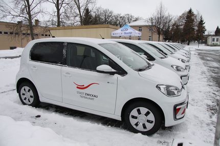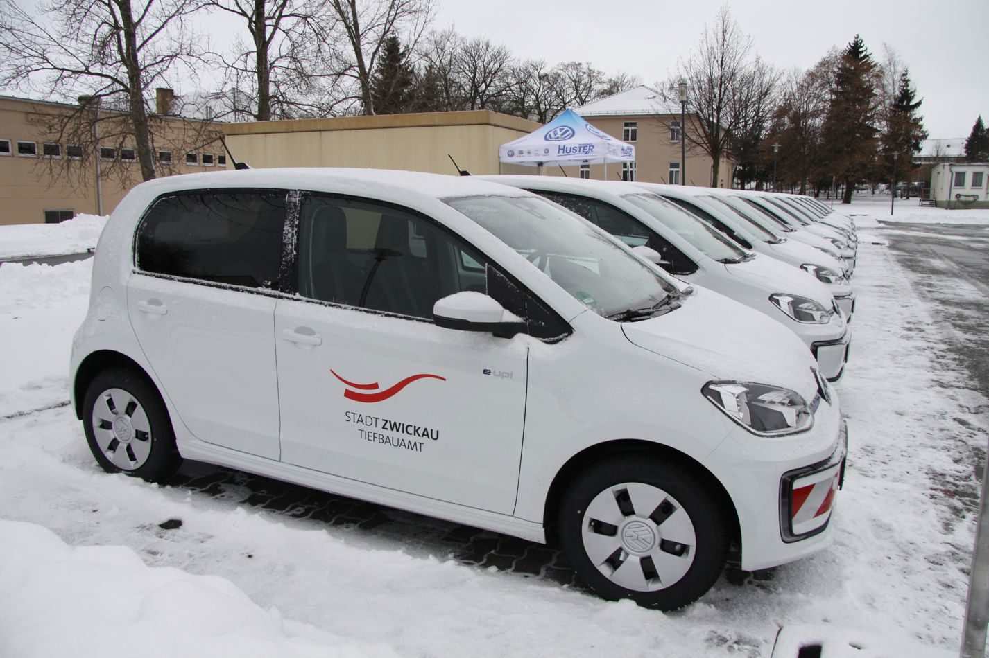 Die Stadtverwaltung Zwickau verfügt von heute an über elf Elektrofahrzeuge. Die Autos vom Typ VW E-Up wurden am Vormittag vom Zwickauer Autohaus Huster an Oberbürgermeisterin Dr. Pia Findeiß übergeben. Sie werden nun in unterschiedlichen Fachämtern eingesetzt. Zu den Nutzern gehören das Umweltbüro, das Kulturamt, das Bauordnungsamt, das Tiefbauamt, das Ordnungsamt, das Amt für Schule, Soziales und Sport und das Garten- und Friedhofsamt. Eines der Leasingfahrzeuge steht für alle Ämter zur Verfügung. Für den Betrieb wurden bereits im Dezember insgesamt sechs Ladesäulen im Verwaltungszentrum sowie im Innenhof des Goldnen Ankers errichtet.