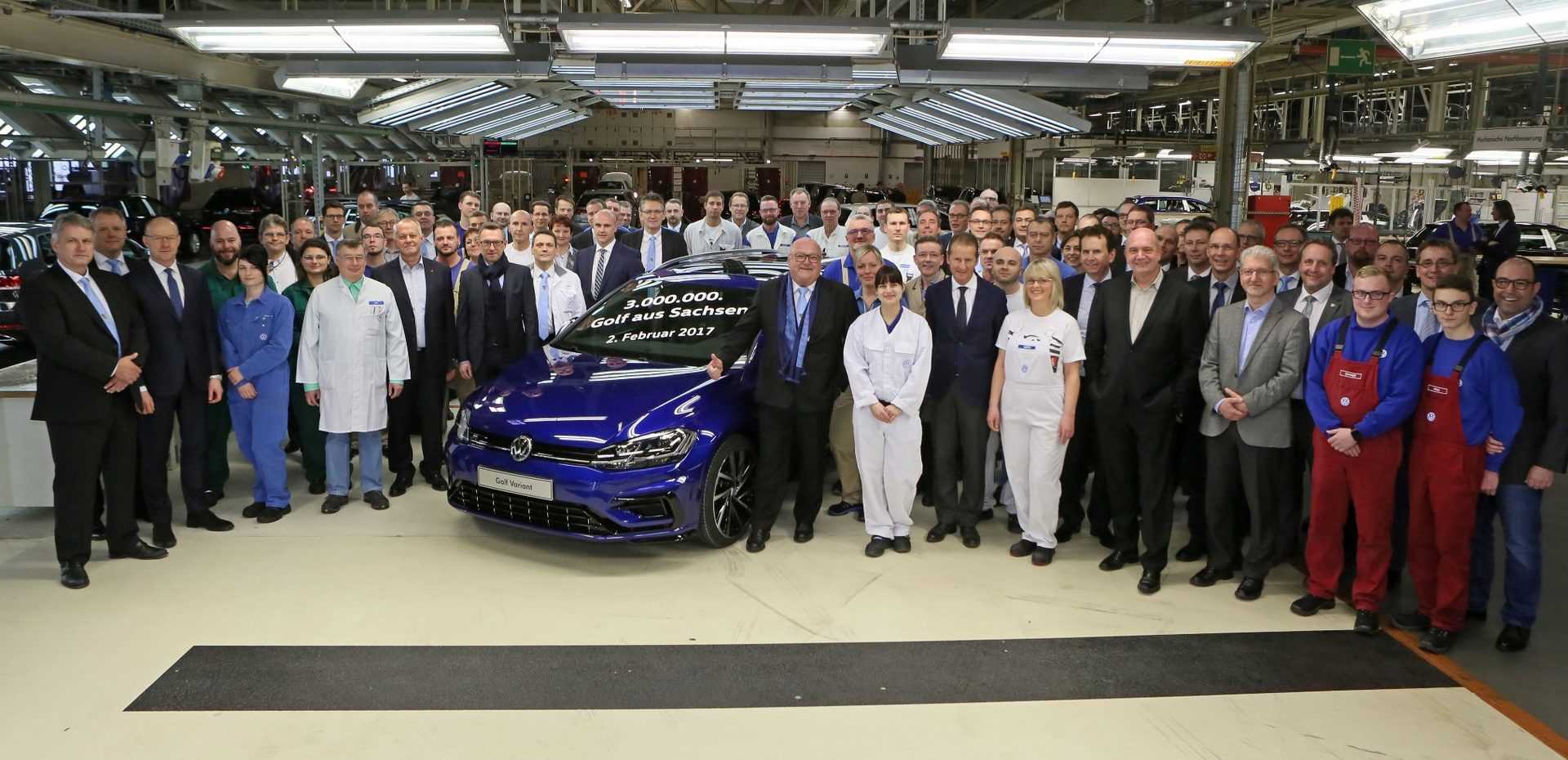 Im Volkswagenwerk Zwickau lief gestern der 3-millionste in Sachsen gefertigte Golf vom Band. Im Zuge des Standortsymposiums kündigte der Autobauer außerdem an, in diesem Jahr deutlich mehr Fahrzeuge als 2016 fertigen zu wollen. Das Werk wird als erster Standort der Marke Volkswagen ab 2019 außerdem ein Elektrofahrzeug auf der Basis des Modularen Elektrifizierungsbaukastens (MEB) bauen.