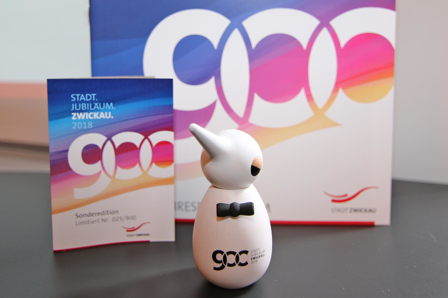 Ein besonderer Sympathieträger dürfte auch der „Festvogel“ sein. Er stammt aus der alteingesessenen Drechslerei Baumann in Zwickau-Oberplanitz. Der heutige Firmeninhaber, Daniel Baumann, ist der Großneffe des Schauspielers Gert Fröbe, der in dem Haus 1913 geboren wurde. Der Spaßvogel erscheint zum Festjahr in einer Sonderedition mit Fliege und entsprechendem Aufdruck. Die ersten Exemplare der auf 900 Stück limitierten Sonderedition erhielten heute die Hauptsponsoren. Alle anderen Interessenten können den Festvogel, dessen Markenzeichen ein beweglicher, aufgesetzter Kopf ist, ab der diesjährigen Museumsnacht am 24. Juni 2017 in der Tourist Information sowie in den städtischen Museen zum Preis von 16 Euro erwerben.
