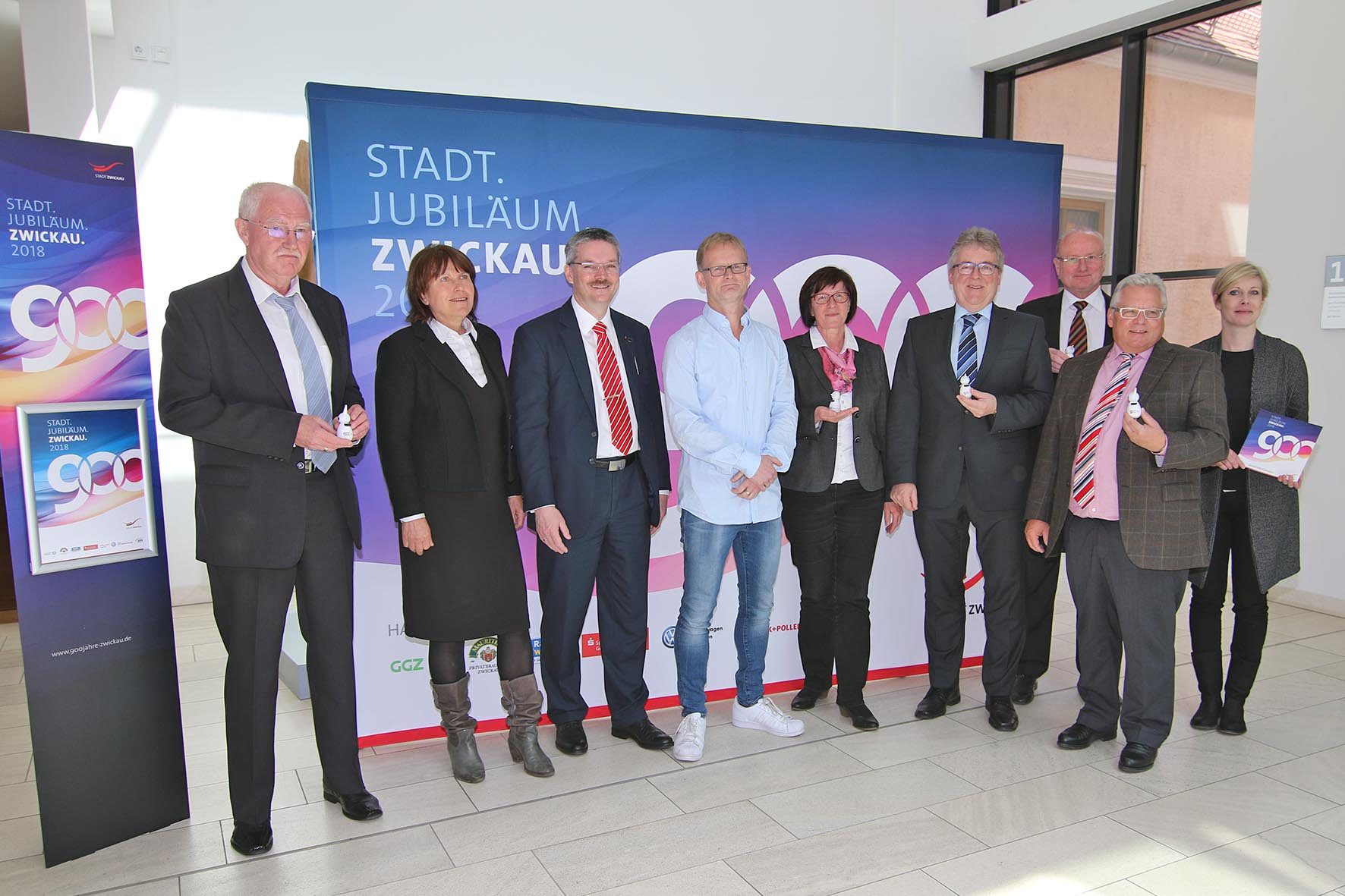 Bürgermeister Bernd Meyer und Oberbürgermeisterin Dr. Pia Findeiß mit den Vertretern von Sparkasse Zwickau, Radio Zwickau, GGZ, ZEV, Volkswagen Sachsen und Mauritius Brauerei.
