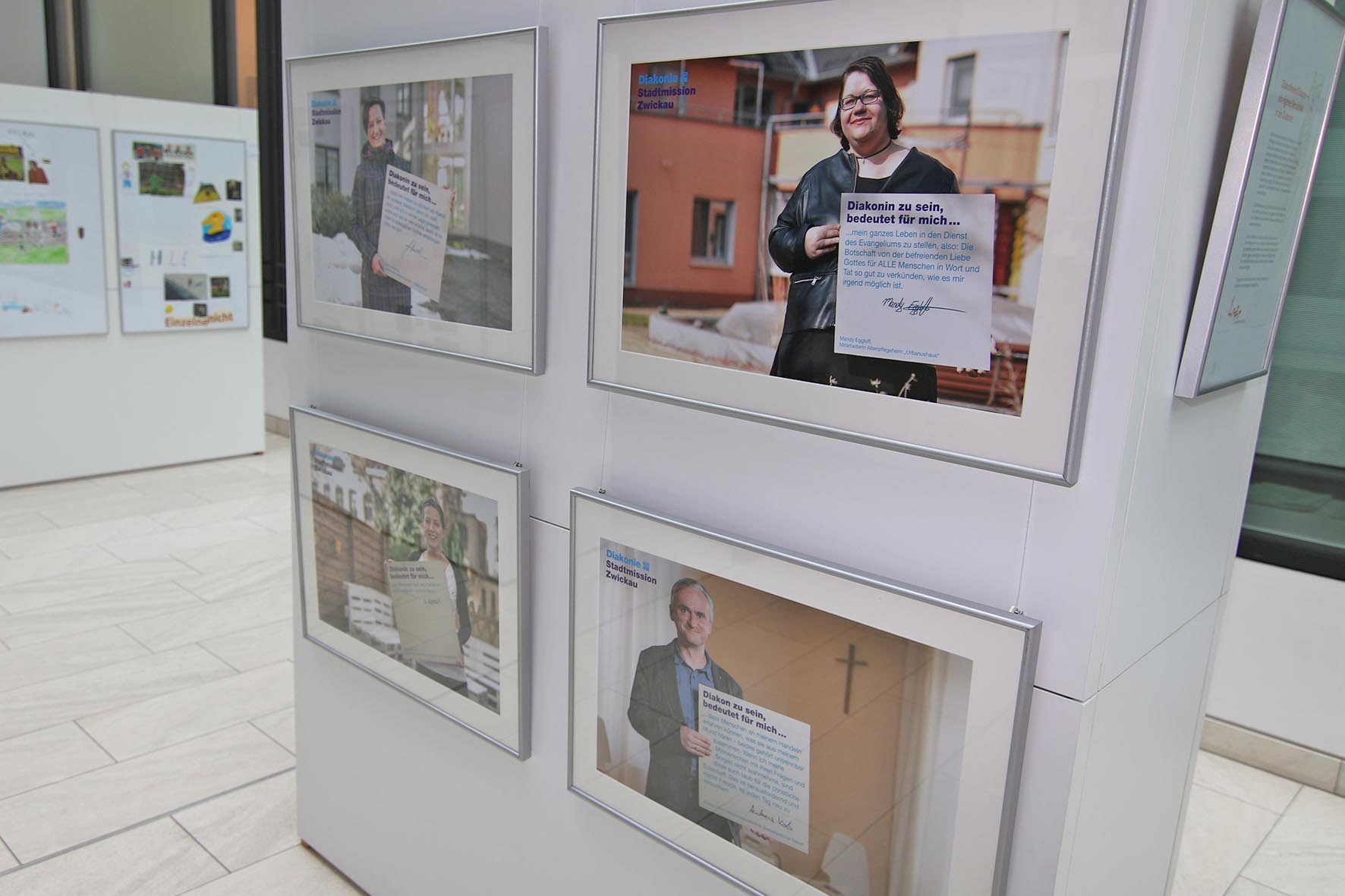 Um Interessierten schon jetzt die Möglichkeit zu bieten, einen Blick auf die entstandenen Objekte zu werfen, haben sich alle Beteiligten entschieden, einiges in dieser kleinen Schau bis zum 22. Mai im Foyer neben dem Bürgersaal auszustellen. Zusammengekommen ist eine bunte Vielfalt. Beteiligt hat sich, neben den Jungen Gemeinden und Christenlehren des Kirchkreises, vor allem auch die Diakonie, die mit einer Fotoserie zum Thema „Diakon zu sein, bedeutet für mich…“, einem Film, der Bibelverse in Gebärdensprache übersetzt und einer Tür, die als Thesenort fungiert, in der Ausstellung vertreten ist. Darüber hinaus gibt es eine multimediale Fotoserie zum Leben Martin Luthers mit Spielzeugfiguren, eine Vielzahl von Collagen und Bildern, die das Motto künstlerisch umsetzen, aber auch Fotoserien über Standbilder bzw. eine Tür auf einem Feld, die bei stürmischem Wetter mit Thesen, Forderungen und Wünschen der Jungen Gemeinde aus Leubnitz beschlagen wurde.