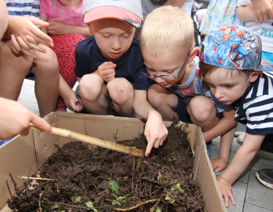 Nach den einzelnen Präsentationen ging es für die Kids noch einmal auf gemeinsame Entdeckertour. Jörg Schneider von der Grünen Liga Westsachsen e. V. war mit einem Eimer voll Kompost in die Kita gekommen und zeigte, wie viel Vielfalt in einem Humushaufen steckt. Welke Blätter, alte Kaffeefilter und Äste seien nicht nur vielfältiger Abfall, sie sind auch ein wichtiger Lebensraum für die Tierwelt. Sich davon zu überzeugen bedurfte bei den Steppkes keiner großen Aufforderung. Schnell hatten sie kleine Stöckchen in der Hand und durchforsteten den Haufen. Das Aufstöbern von Regenwürmern machte besonderen Spaß.