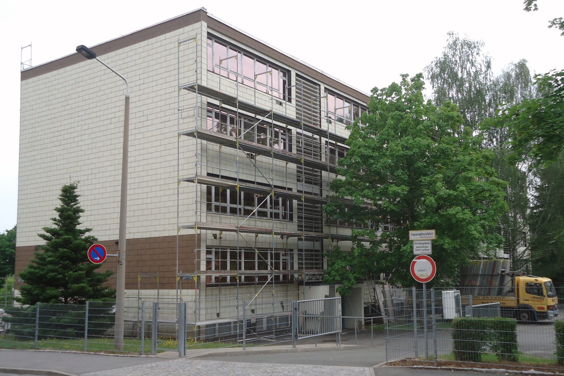 Mit dem Aufbau des Gerüstes konnte bereits in der vergangenen Woche begonnen werden. In dieser Woche war der Start für Sicherungsmaßnahmen. Dazu gehören beispielsweise der Schutz der Bodenbeläge, die erhalten bleiben sollen, oder das Abkleben von Türen. Die Sanierung im Gebäude und der Abbruch der Fassadenverkleidung beginnen voraussichtlich am 3. Juli. Die Kosten betragen entsprechend des vom Stadtrat gefassten Vorhabensbeschlusses rund 3,57 Mio. Euro. Darin enthalten sind Fördermittel des Freistaates Sachsen in Höhe von fast 1,35 Mio. Euro.