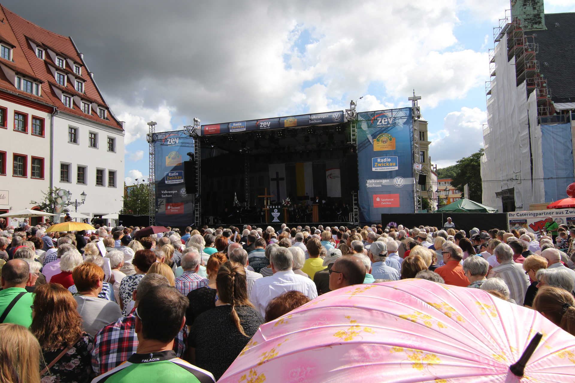 „Was zählt“ war das kurze und prägnante Motto des traditionellen 16. Ökumenischen Stadtfest-Gottesdienstes am Sonntagmorgen auf dem Zwickauer Hauptmarkt. Auch diesmal strahlte, wie fast jedes Jahr, wieder die Sonne für ca. 2000 Menschen, die sich ab 10 Uhr zum diesem besonderen Stadtgottesdienst einfanden.
