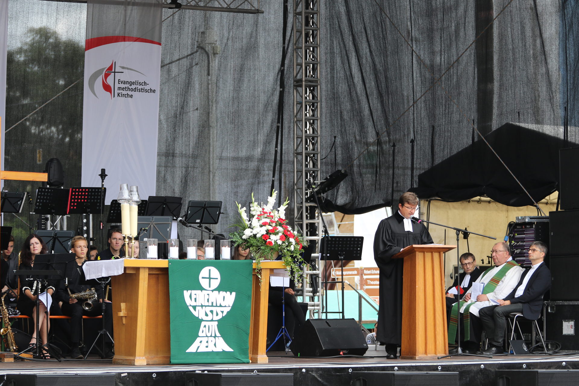 Heute gab es eine Premiere: Ein halbes Jahr nach seinem Umzug hielt Harald Pepel, neuer Superintendent für den evangelisch-lutherischen Kirchenbezirk Zwickau, an dieser Stelle unter freiem Himmel seine erste Predigt. Er kam wohl damit noch ein Stück mehr in seiner für ihn immer noch etwas neuen Stadt Zwickau an, in die sich der gebürtige Siebenbürger-Sachse, wie er verriet, nach und nach einlebt. Harald Pepel hatte die Nachfolge von Eberhard Dittrich angetreten, der im Januar 2016 in den Ruhestand versetzt wurde und der in seiner Amtszeit viele Jahre lang den Stadtfestgottesdienst mit begleitete und prägte.