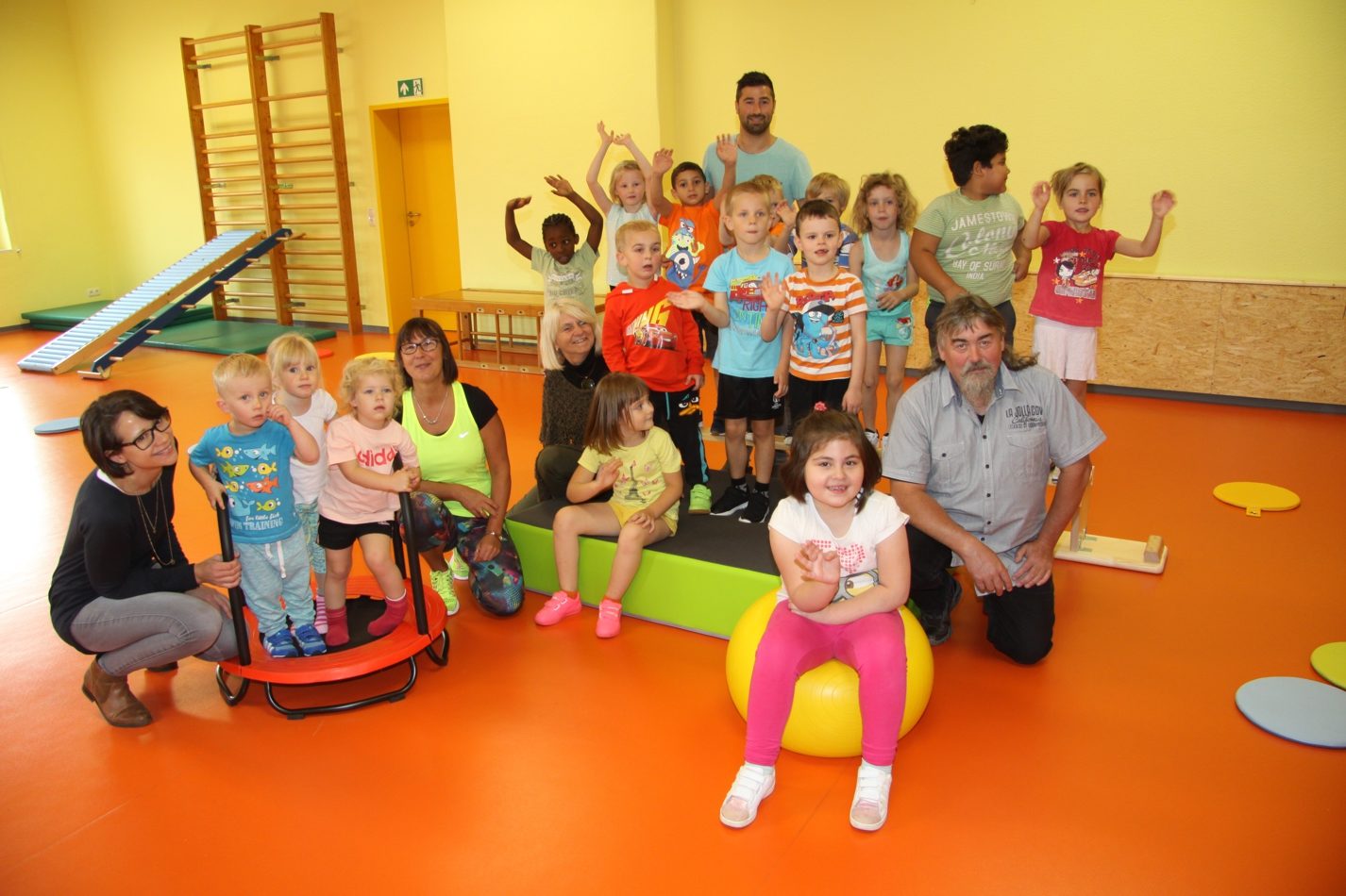 In der hauseigenen kleinen Turnhalle ging es dann auch gleich richtig zur Sache. Die quirligen Steppkes nahmen begeistert ihre neuen Geräte in Besitz. Sie sprangen, hopsten und balancierten, was ihre Kräfte hergaben. „Die Geräte sind eine wunderbare Ergänzung für unser tägliches Sportangebot in den Gruppen.“ freut sich Gabriele Heinzig, Leiterin der Kita. „Jeden Tag ist eine andere Kindergruppe in der Turnhalle und absolviert – spielerisch versteht sich - eine Art Sportunterricht. Aber wir bieten auch Zeit für freies Spiel und Turnen an den Geräten. Und auch die 1- bis 3-Jährigen werden 14-tägig ihrem Alter entsprechend sportlich gefördert.“