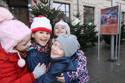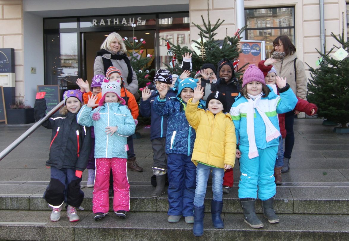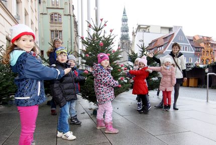 Minipäckchen, Salzteigsterne, Perlenzapfen - Kitas schmücken Weihnachtsbäume vorm Rathaus
