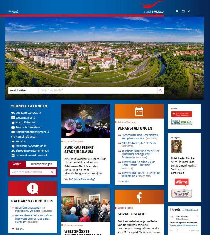 In neuem Design zeigt sich heute der städtische Internetauftritt unter www.zwickau.de. Die Veränderungen zielen jedoch nicht primär auf ein neues Erscheinungsbild ab. Die Seiten sind nun im „Responsive Design“ angelegt, d. h. dass sie sich jedem Betrachter so übersichtlich und benutzerfreundlich wie möglich präsentieren, unabhängig davon, ob er mit Smartphone, Tablet, Laptop oder PC zugreift.