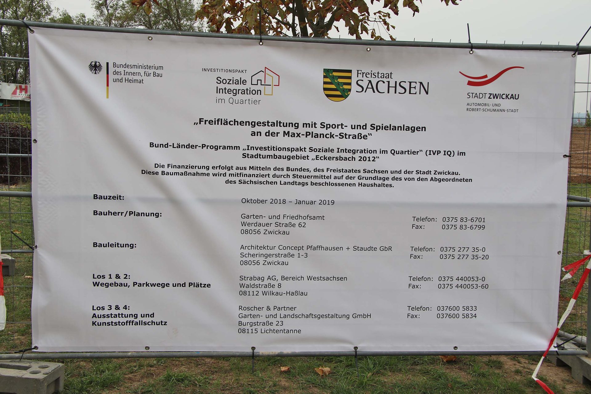Ein Zuwendungszweck des Förderprogramms sind der Erhalt und Ausbau von Freiflächen. Im Stadtumbaugebiet „Eckersbach 2012“ soll eine gestaltete Freifläche mit Spiel- und Freizeitaktivitäten entstehen, um einen Ort der Integration im Quartier zu schaffen. Das Garten- und Friedhofsamt erstellte die Planung der Freifläche. Auf dem ca. 1 ha großen Areal wird ab Oktober 2018 eine neu gestaltete Freifläche mit Sport- und Spielangeboten entstehen. Grünflächen und insbesondere Spielplätze sind ein Ort der Begegnung. Für Menschen unterschiedlichen Alters und mit mannigfaltigen (Freizeit)Interessen wird eine gemeinsame Basis geschaffen, um einen Dialog zu ermöglichen und Zeit miteinander zu verbringen. Im Vordergrund des Projektes stand deshalb das Ziel, dem demografischen Wandel in Eckersbach entgegenzuwirken und nachhaltig das Wohnumfeld zu verbessern. Ermöglicht wird dies durch die Schaffung von allwettertauglichen Wegen sowie dem Bau einer Multifunktionssportanlage und eines Spielbereiches mit Kletterpyramide. Unweit der Wohnbebauung wird es durch die neue Infrastruktur zukünftig möglich sein, seine Freizeit aktiv zu gestalten und bspw. den ca. 190 Meter langen Weg in Nord-Süd-Richtung mit Inlineskates zu benutzen. Auch der Anschluss an das Eckersbacher Rundwanderwegsystem rückt in greifbare Nähe. Viele Menschen werden die städtische Grünfläche auch nutzen, um den Ausblick auf das historische Stadtzentrum Zwickaus zu genießen oder das neu errichtete Stadion zu erreichen. Nach dem Abholen der Kinder aus der Kita werden Eltern dann hoffentlich selten um einen Besuch auf dem nahen Spielplatz herumkommen, wo getobt und Ball gespielt werden kann.