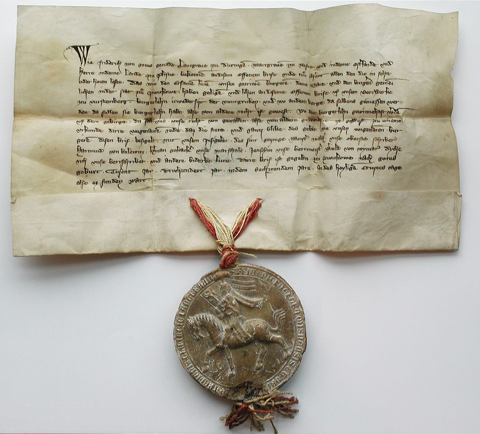Ebenfalls aus dem Stadtarchiv stammt das „Bürgerlehen“. In dieser Urkunde, einem Pergament mit Wachssiegel, vom 3. Mai 1316 bestätigt der Meißnische Markgraf Friedrich der Gebissene die Bergbaurechte der Stadt Zwickau am „Hohen Forst“. Dies ist der erste Nachweis über bergbauliche Tätigkeit in der Zwickauer Region.