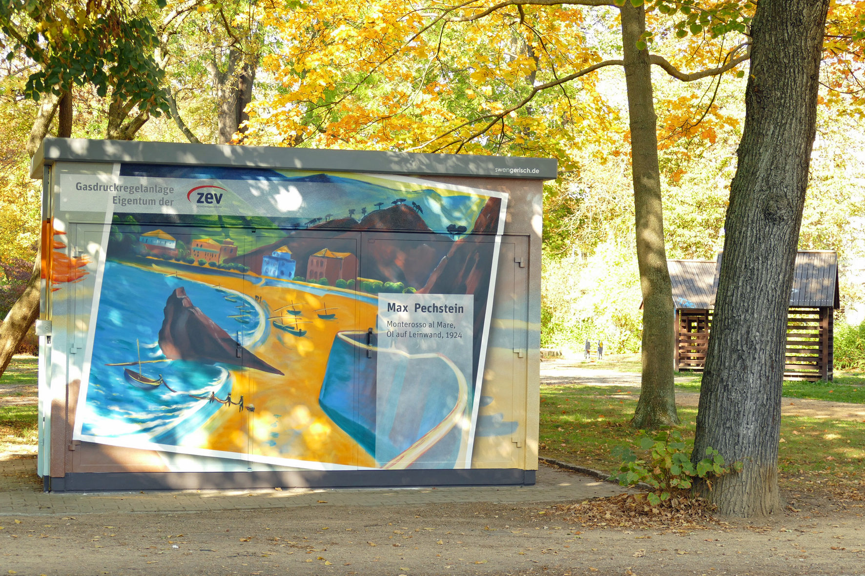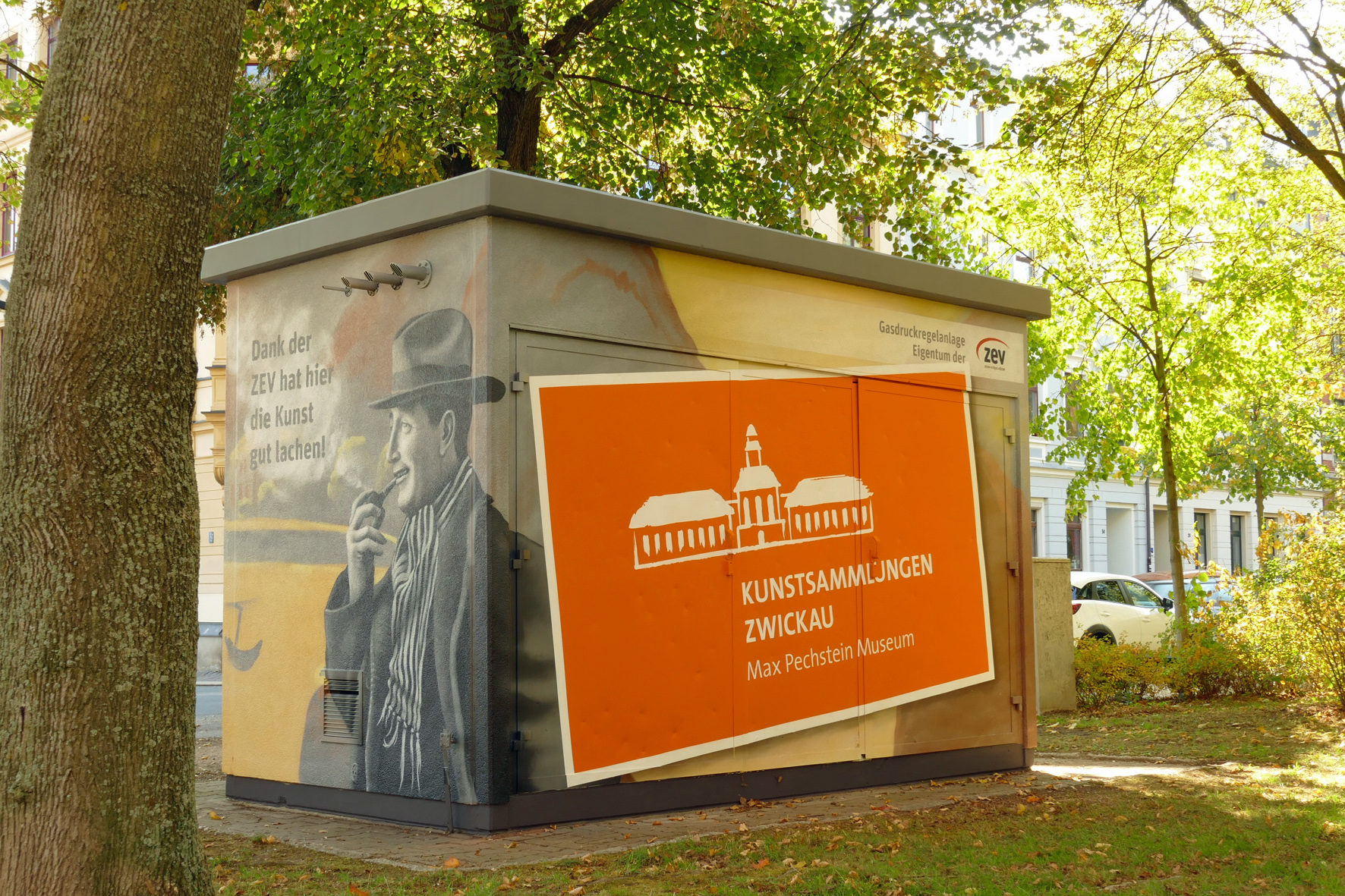 Die Zwickauer Energieversorgung GmbH (ZEV) wirbt seit letzter Woche mit einem Graffiti für die KUNSTSAMMLUNGEN ZWICKAU mit dem Max-Pechstein-Museum. Die sogenannte Gasdruckregelanlage befindet sich in der Nähe der Einrichtung an der Osterweihstraße und war vor der Aufarbeitung mit illegalen Schmierereien übersät. Die neue Gestaltung erfolgte in enger Abstimmung mit den Kunstsammlungen sowie der Familie Pechstein. Hauptmotiv ist das 1924 entstandene Ölgemälde Monterosso al Mare. Julia Pechstein, Enkelin des in Zwickau geborenen Künstlers, zeigt sich nach Angaben der ZEV erfreut über die Initiative: „Ich war sehr gespannt, wie die Umsetzung aussieht, und bin begeistert. Die frische, lebendige und einladende Darstellung ist eine Bereicherung für das Stadtbild von Zwickau.“
