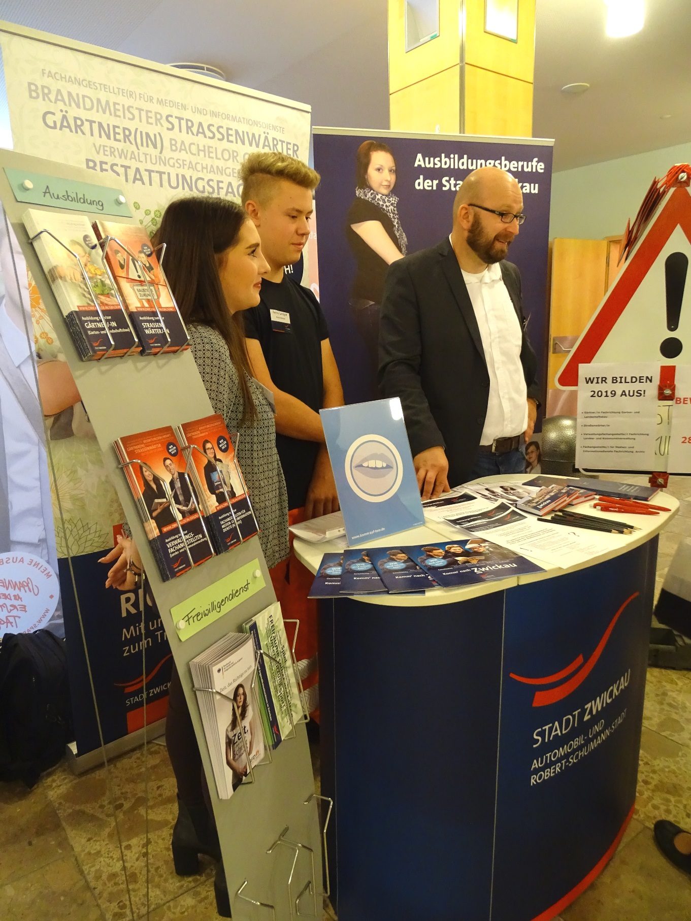 Die Stadt Zwickau war als Austeller mit einem Stand ebenfalls vertreten. Interessenten konnten sich über die vielfältigen Ausbildungsmöglichkeiten im verwaltungstechnischen sowie handwerklichen Bereich informieren. „Unser Stand war die ganze Zeit sehr gut besucht. Viele haben sich über die Ausbildungsmöglichkeiten für den Ausbildungsbeginn 2019 informiert, aber auch über Praktika oder den Ausbildungseinstieg 2020“, sagt Sebastian Poch, Ausbildungsleiter. Der Effekt einer Messeteilnahme sei nicht immer sofort messbar. Doch die persönliche Kontaktaufnahme und bei den Interessenten im Gedächtnis zu bleiben sei heute, wo sich die potentiellen Azubis aus vielen Möglichkeiten einen Ausbildungsbetrieb wählen können, umso wichtiger. „Unser Auszubildender und unsere Studentin konnten aus erster Hand von ihren Erfahrungen in der Stadtverwaltung berichten. Das wurde von den Schülerinnen und Schülern sehr gern angenommen.“
