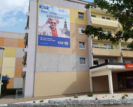 Deutlich sichtbar gratuliert die Gebäude- und Grundstücksgesellschaft Zwickau mbH (GGZ) der Stadt seit heute zum 900jährigen Stadtjubiläum. Als überdimensionale Glückwunschkarte dient dafür eine 5 mal 7 Meter große Werbeplane. Diese wurde an die Fassade eines Wohnhauses im Alten Steinweg montiert. Das kommunale Unternehmen bringt ihr gesellschaftliches und wirtschaftliches Engagement auch an anderen Stellen ein. Die GGZ ist unter anderem einer der Hauptsponsoren von „900 Jahre Zwickau“.
