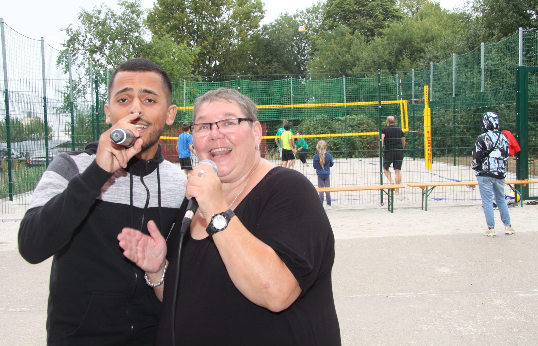 Wer die Woche sportlich ausklingen lassen wollte, konnte sich nach dem offiziellen Teil mit Schlüsselübergabe am spontanen Beachen und Pritschen in der neuen Anlage beteiligen. Für den musikalisch-unterhaltsamen Rahmen sorgten die DJs Lösch & MSD. Besonderen Ohrenschmaus boten die Special-Gusts - und aktuellen Zwickauer Superstars -  Dyaa Kassouma und Rebecca Klukas. Mit ihrem deutsch-arabischen Song „Es gibt Hoffnung“ punkteten sie bereits sieggekrönt im Stadtfest-Wettbewerb „Zwickaus Superstar“ und rappten sich auch heute wieder in die Herzen der Jugendlichen und Gäste. Bei deftigem Kesselgulasch, Selbstgebackenem und erfrischenden Durstlöschern gab es rund um den Volleyballplatz dann noch reichlich Gelegenheit, miteinander ins Gespräch zu kommen und weitere Pläne zu schmieden. „Neben der Anlage ist noch eine Freifläche. Dort könnten später mal noch Bänke oder Sitzgruppen aus Europaletten für Zuschauer stehen.“ so Tinzmann.