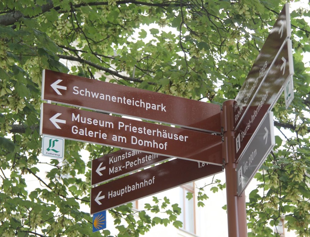 Die braune Grundfarbe der Wegweiser mit weißer Schrift wird bundesweit für die Ausschilderung touristischer Ziele verwendet. Die Wegweiser zu den öffentlichen Toiletten, die im Zuge der Erneuerung ergänzt wurden, sind grau. Zusätzlich wurde die Wegweisung der Jakobswege und des Lutherwegs - soweit diese im inneren Stadtgebiet verlaufen - in das neue Wegweisungssystem integriert.