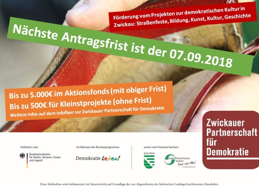 Die Fach- und Koordinierungsstelle der Zwickauer Partnerschaft für Demokratie weist darauf hin, dass in diesem Jahr für Projekte, die bis zum 31. Dezember 2018 abgeschlossen werden, noch 25.000 Euro an Fördergeldern zur Verfügung stehen. Die Maßnahmen sollen sich der Verbesserung der demokratischen Kultur in Zwickau widmen.