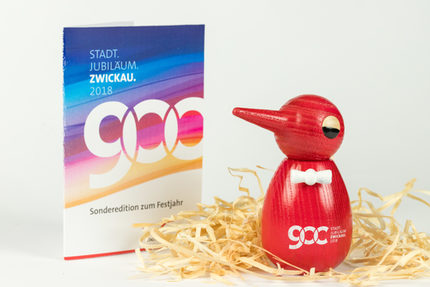 Zwickauer und Gäste der Automobil- und Robert-Schumann-Stadt können also hier, ebenso wie z. B. in der Tourist Information oder in den Kultureinrichtungen der Stadt Zwickau, einige schöne Erinnerungsstücke an das Festjahr erwerben. Dazu gehören unter anderem die Holztaler, auf denen neben dem offiziellen Jubiläums-Logo auch die fünf Zwickauer Originale ‑ Gert Fröbe, Robert Schumann, Max Pechstein, die Benzinsicherheitslampe und der Trabant – zu sehen sind. Der Erlös kommt der Aktion „Wir schenken uns einen Spielplatz“ ‑ einem Gemeinschaftsprojekt zur Verschönerung des Schwanenteichareals ‑ zu Gute.