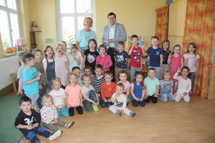 Am Montag konnte Marcel Kruppa, amt. Leiter Amt für Schule, Soziales und Sport, eine weitere Spende für den neuen Spielplatz am Schwanenteich entgegennehmen.  Überreicht wurde sie von Kindern und Erzieherinnen der kommunalen Kita „Am Wasserturm“ in Oberplanitz. Fast 500 Euro spielten die Steppkes und das Kita-Team mit ihrem kleinen Konzert ein, zu dem sie im April in die Aula des Clara-Wieck-Gymnasiums eingeladen hatten. Die Kita steht in Kooperation mit dem Gymnasium und fördert frühkindliche musikalische Bildung. „Unsere Kinder haben eifrig geprobt und waren sehr aufgeregt vor ihrem ersten Auftritt vor so vielen Leuten.“ berichtet Dagmar Jentsch, Leiterin der kommunalen Kita. „Die Mühe und Aufregung haben sich aber mehr als gelohnt. Wir hatten mit ca. 100 Gästen gerechnet. Am Ende waren es fast 170 Eltern, Geschwister, Omas und Opas, die unserem Programm lauschten und nicht zuletzt auch für eine gut gefüllte (Spenden-)Kasse sorgten.“