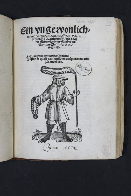 Der ehemalige Franziskaner Johann Locher, der sich 1524 in Zwickau aufhielt, übte in Predigten und Schriften scharfe Kritik an kirchlichen und sozialen Missständen. Johann Locher beschreibt in seinem 1524 erschienen „Müglichen bericht an die zu[e] Zwickaw […]“ den Zustand der Zwickauer Gemeinde, äußert sich anerkennend über die bereits eingeführten Reformen und mahnt die Stadt, ihre Bestrebungen weiter fortzuführen. Gerade die im Laufe des Jahres 1524 publizierten Predigten und Sendschreiben Lochers nehmen innerhalb der Überlieferungsgeschichte eine Sonderstellung ein, da sie ausnahmslos in der Werkstatt Schönspergers (der einzigen Druckerei Zwickaus zu der Zeit) erschienen und kein weiteres Mal gedruckt wurden. Der Titelholzschnitt zeigt einen Bauern mit Dreschflegel und Rosenkranz ‑ Attribute für Bauernstand und Frömmigkeit.