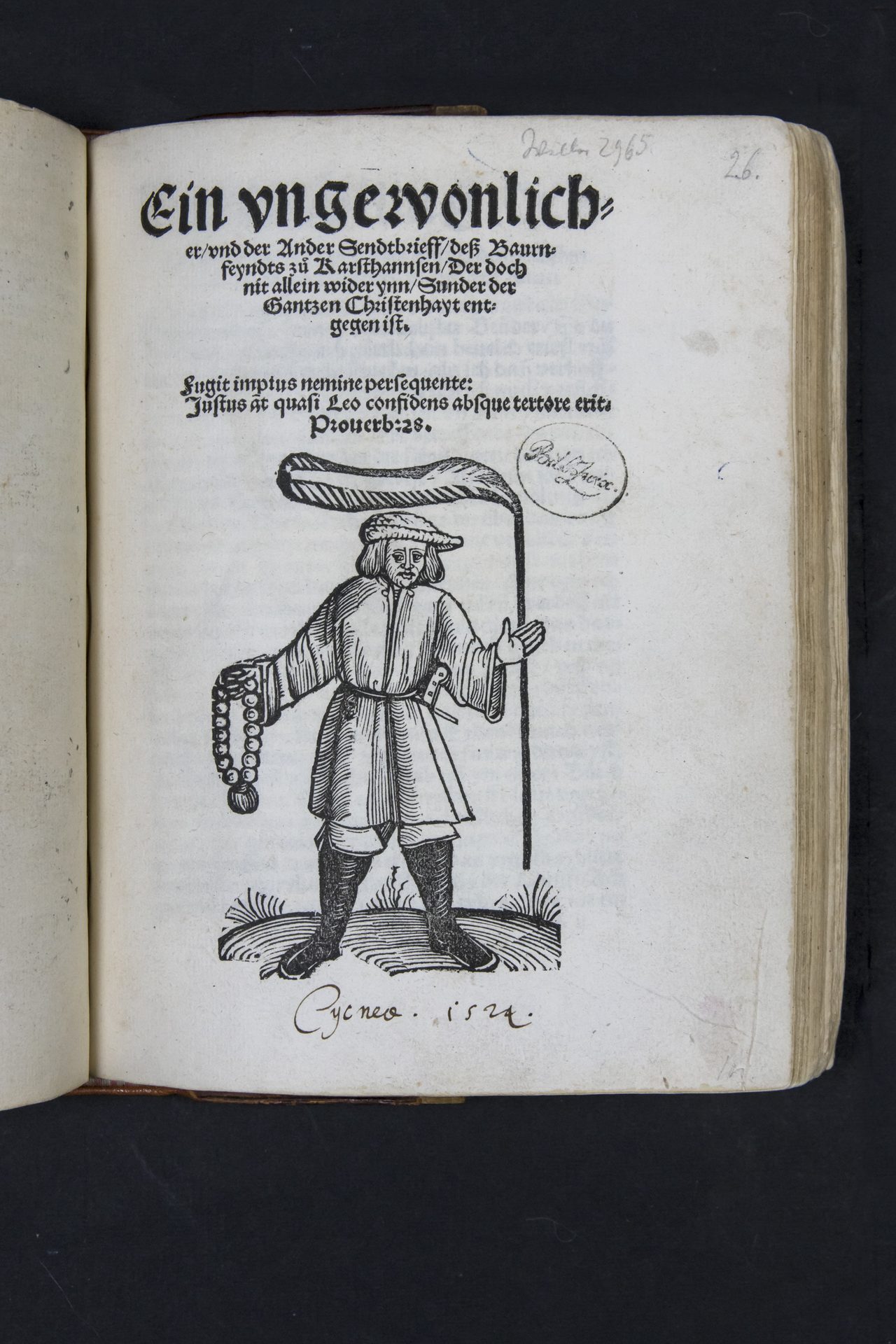 An der Stelle des Stadtrechtsbuches ist also jetzt ein Buch von Johann Locher im Original in der „Schatzkammer“ zu sehen. Es ist eine bedeutende Schrift aus der Reformationszeit. Sie stammt aus dem Nachlass Stephan Roths. Dabei handelt es sich um das Buch von Johann Locher: Ein vngewonlicher/vnd der Ander Sendtbrieff/deß Baurnfeyndts zuo Karsthannsen/Der doch nit allein wider ynn/Sunder der Gantzen Christenhayt entgegen ist. (Zwickau: Jörg Gastel, 1524, Nachlass Stephan Roth, Leihgabe Ratsschulbibliothek Zwickau, Sign.: 17.12.3.(26))