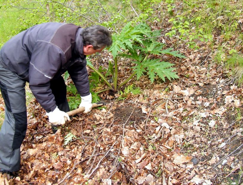 Derzeit sind die Pflanzen noch relativ klein und haben keine Blütenstände ausgebildet. Das frühe Wachstumsstadium wird in diesem Jahr genutzt, um den Bestand dauerhaft zu vernichten. Dabei wird der Spross (Vegatationskegel) ca. 10 bis 15 cm unter der Erdoberfläche diagonal mit einem Spaten durchtrennt. Das bringt die Pflanze zum vollständigen Absterben.