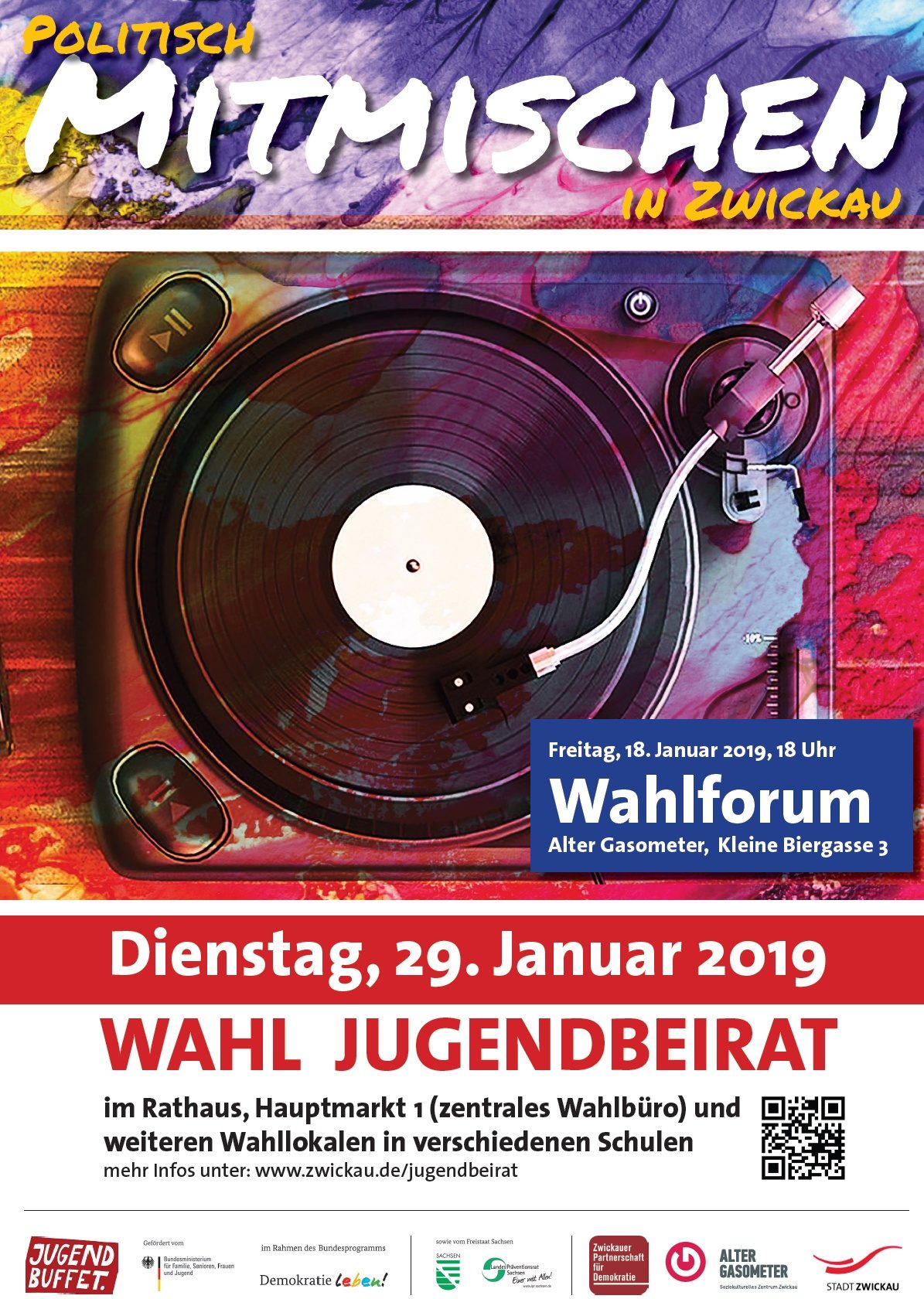 Am Dienstag, dem 29. Januar 2019 findet erstmals in Zwickau die Wahl zum Jugendbeirat statt. Wahlberechtigt sind rund 7.600 Jugendliche im Alter von 14 bis 24 Jahren, die zum Stichtag ihren Hauptwohnsitz in der Stadt hatten. Die Wahllokale befinden sich im Rathaus sowie in sechs Schulen. Zu beachten sind die unterschiedlichen Öffnungszeiten.