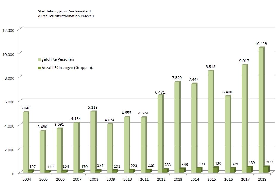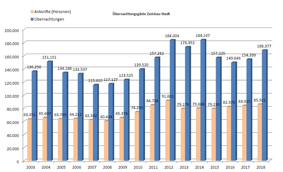 Der positive Trend im Tourismus hält an: Sowohl die Zahl der Übernachtungsgäste als auch die Zahl der Übernachtungen sind 2018 weiterhin gestiegen. Dies teilt die städtische Kultour Z mit. Demnach konnte Zwickau im Jubiläumsjahr „900 Jahre Zwickau“ fast 86.000 Übernachtungsgäste begrüßen.