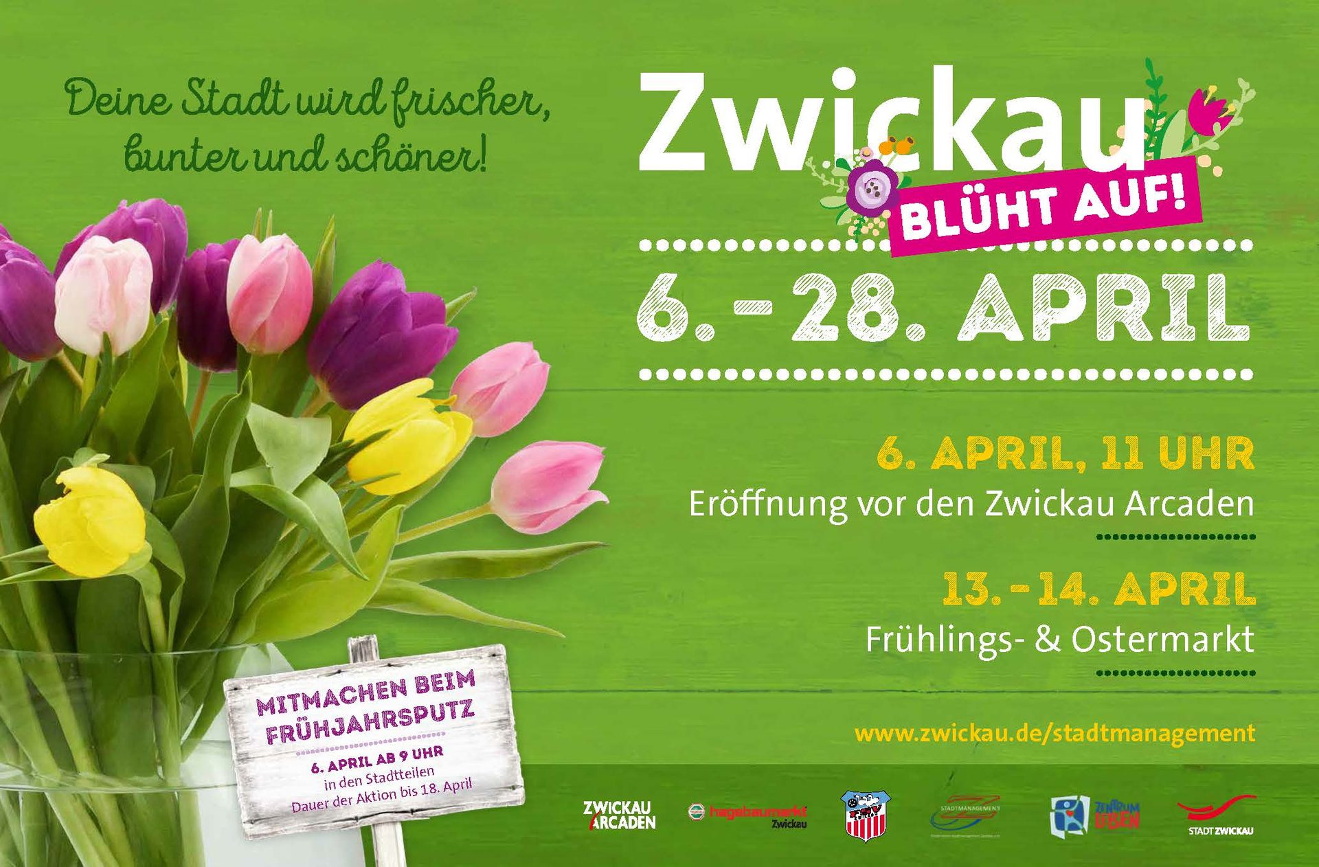 „Zwickau blüht auf“ – Runde Nr. 3 für das stadtbildbelebende Maßnahme-Paket zum Start ins Frühjahr! Vom 6. bis 28. April 2019 lädt die beliebte Gemeinschaftsaktion von Händlern, Blumenläden, Garten- und Baumärkten sowie vielen weiteren engagierten Partnern zum Bummel durch die frühlingserwachte Zwickauer City ein. Unterstützt sowie mit Rat und Tat begleitet werden die Aktivitäten durch Ämter der Stadtverwaltung Zwickau und den Förderverein Stadtmanagement Zwickau e. V. In diesen Wochen laufen vielerorts die Vorbereitungen. Zu den mittlerweile beliebten Elementen kommen neue Ideen. Erst einmal sind jedoch viele Helfer gefragt, wenn es um das große Aufräumen und Saubermachen in der City am 23. März sowie in den Stadtteilen vom 6. bis 18. April geht.