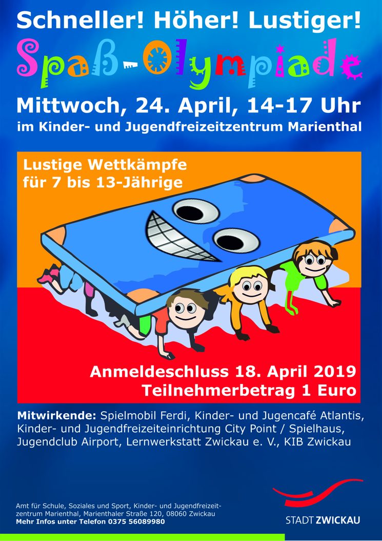 Ganz schön lustig wird´s am Mittwoch, 24. April 2019 im Kinder- und Jugendfreizeitzentrum Marienthal, Marienthaler Straße 120. Dann findet wieder eine große Spaßolympiade für Kinder von 7 bis 13 Jahre statt. Freuen können sich die Kids auf amüsant-sportliche Nonsens-Spiele, bei denen es weniger um die sportliche Leistung sondern um jede Menge Spiel-Spaß geht.