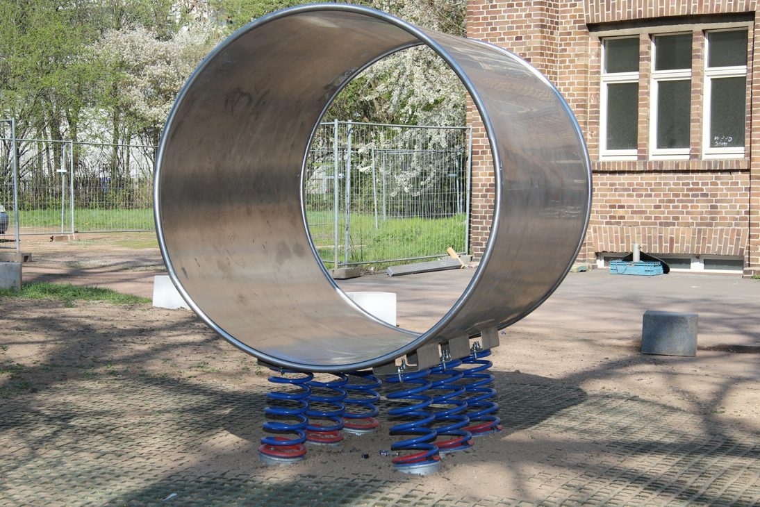 Die kleine Platzfläche erhielt einen frischen Belag aus Magnumplatten, neue Bänke und Bepflanzungen und lädt nun wieder zum Verweilen ein. Unmittelbar neben der Sitzecke können Kinder einen kleinen Spielpunkt mit einer Wackeltonne nutzen. Ein gepflasterter Weg verbindet den Spielpunkt mit der Sitzecke.