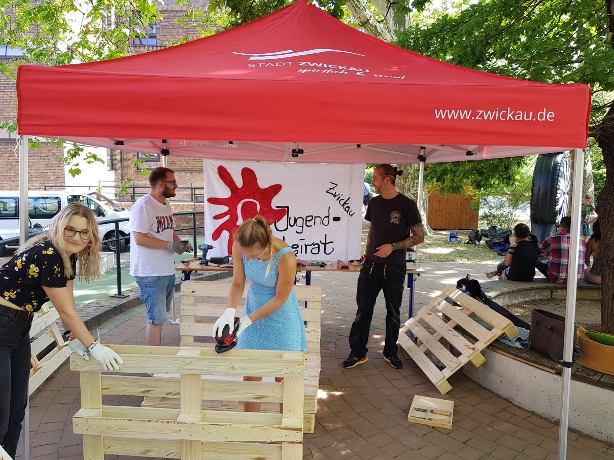 Derzeit touren Mitglieder des Jugendbeirates durch Zwickau, um für sich zu werben und sich bei den Kindern und Jugendlichen vorzustellen. An den letzten Schultagen Anfang Juli waren die Jugendlichen bereits in der Pestalozzischule, Seminarstraße 3, zu Gast und nutzten ihre Aktion „Paletten-Möbelbau fürs neue Büro im City Point“, um im lockeren Rahmen mit den Schülerinnen und Schülern ins Gespräch zu kommen.