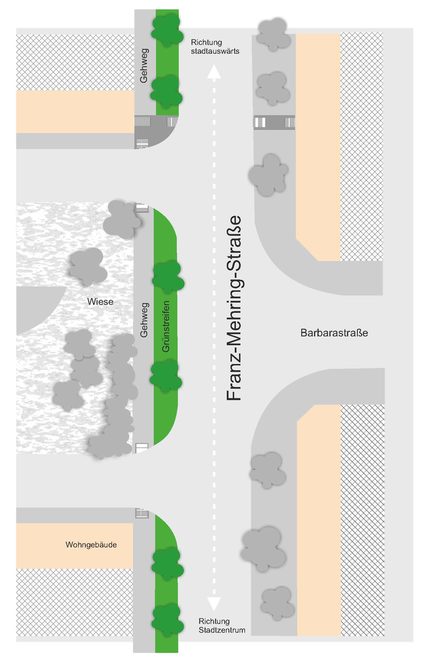 Die Fahrbahnbreite beträgt derzeit 7,50 m. Sie soll sowohl für die Bauzeit als auch zukünftig auf 5,50 m reduziert werden. Eine Fahrbahnbreite von 5,50 m ist nach den derzeit gültigen Vorschriften (Richtlinien für die Anlage von Stadtstraßen, Ausgabe 2006) für den fließenden Verkehr ausreichend, da kein Busverkehr im genannten Abschnitt der Franz-Mehring-Straße stattfindet. Die Restfahrbahnbreite von 2,00 m dient während der Bauphase als Arbeitsraum und zukünftig für das Längsparken.