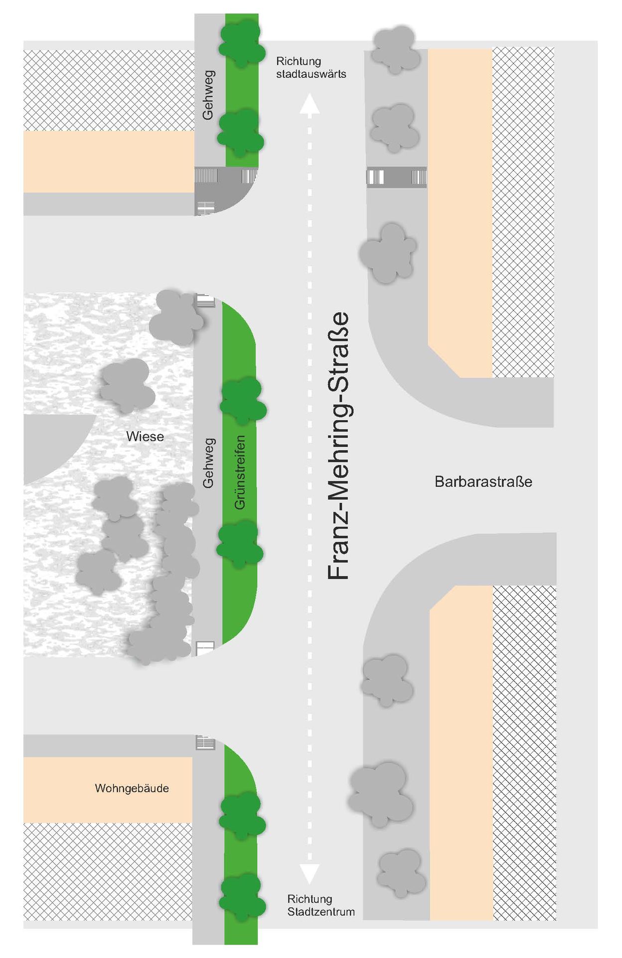 Im Bereich des Grünstreifens wird die oberste Bodenschicht aufgelockert und - auf Grund der Lichtverhältnisse unter den Bäumen und der zukünftigen Unterhaltung - mit Schotterrasen abgedeckt. Die hintere Gehwegkante wird mit Betontiefborde eingefasst, die am Fahrbahnrand vorhandene Natursteinborde bleibt und wird nach Bedarf neu ausgerichtet, z. B. an Querungsstellen und Zufahrten.
