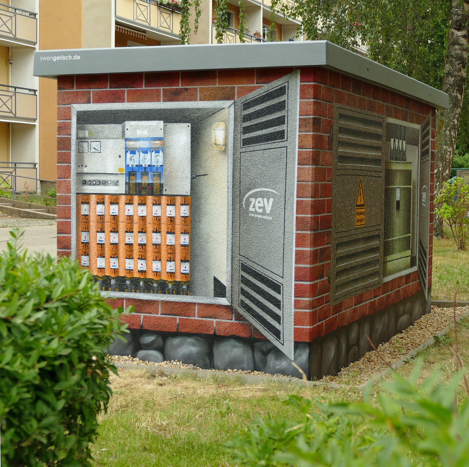 Für die Umsetzung des Graffitis war erneut Swen Gerisch verantwortlich. Der Künstler aus Reinsdorf arbeitet seit mehreren Jahren mit der ZEV zusammen und kümmerte sich bereits um die Verschönerung diverser Strom- und Gashäuschen des Energieversorgers. Wie das Unternehmen mitteilt, sollen 2019 auf weiteren Trafostationen bzw. Gashäuschen farbige Akzente gesetzt werden.