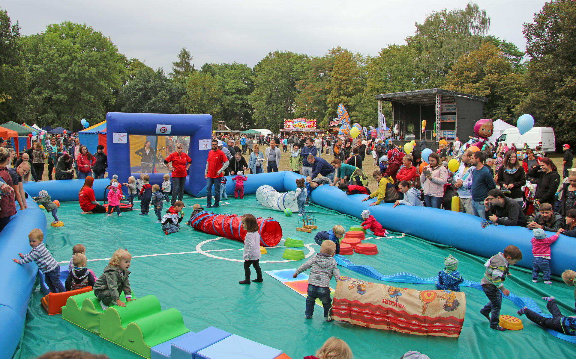 Immer wieder außergewöhnliche Ideen hat auch Volkswagen Sachsen. Dank der tollen VW-Offerten ist auf der Kranichwiese wie gewohnt wieder mächtig viel Betrieb. Zwei imposante Riesenrutschen sind optisch und vom Action-Potential her ein echter Kracher und Mittelpunkt dieser Wiese. Nach Zwickau also diesmal die größte Hüpfburg Deutschlands und die hat ein gigantisches Ausmaß.