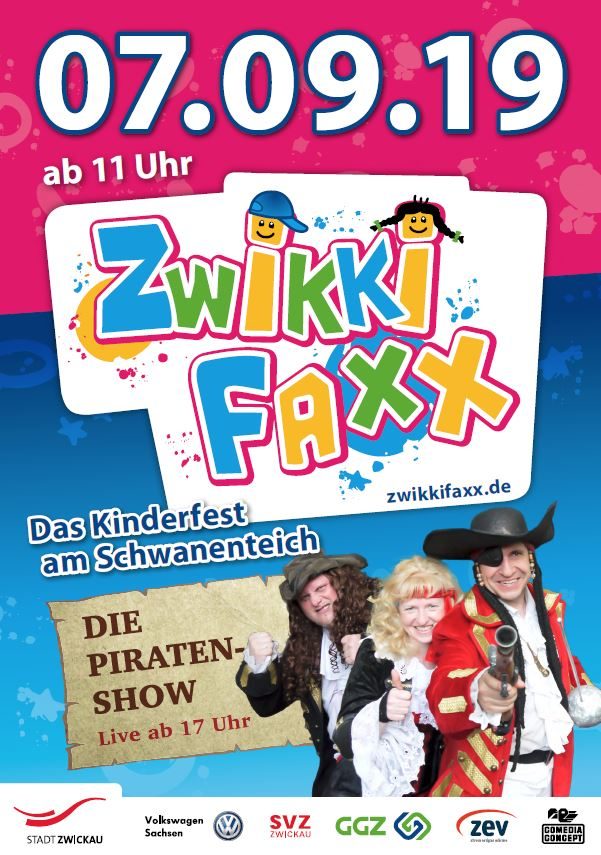 Kinder, Eltern, Großeltern und Freunde sind herzlich eingeladen, den 10. ZWIKKIFAXX-Geburtstag gemeinsam mit allen engagierten Organisatoren und Unterstützern zu feiern. Das Veranstaltungsgelände wird diesmal zur Pirateninsel. Ein Piratenschiff als Hüpfburg, ein Riesenkrake und viele andere Ideen rund um das Motto „Piraten“ sorgen für eine stimmige Kulisse. Krönender Abschluss wird eine tolle Piratenshow sein. Die startet um 17 Uhr auf der Melzerwiese. Das Programm auf der Kinderbühne lädt zum Mitlachen, Tanzen und Mitmachen ein. Erwartet werden zu dieser gigantischen Zwickauer Freiluftveranstaltung für die ganze Familie, die in der Region ihresgleichen sucht, wieder zwischen ca. 20.000 und 25.000 Besucher.