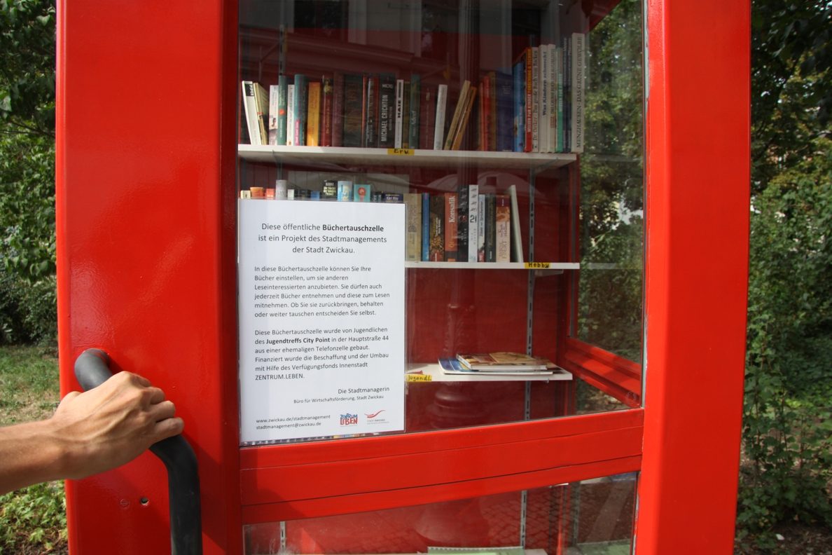 Besucher der Zwickauer Innenstadt können sich auf zwei weitere Attraktionen freuen, die derzeit ihren neuen Platz in der City finden. Aus Mitteln des Verfügungsfonds Innenstadt ZENTRUM.LEBEN hat die Stadt zwei ausrangierte Telefonzellen erworben, die von zwei Jugendeinrichtungen zu öffentlichen Büchertauschzellen umgebaut wurden. Eine Büchertauschzelle ist ein öffentlicher Bücherschrank, in den eigene Bücher eingestellt werden können. Die Bücher dürfen zum Lesen mitgenommen und wenn gewünscht auch behalten werden. Sie können aber auch zurückgebracht werden, um sie wiederum anderen Leseinteressierten zur Verfügung zu stellen.