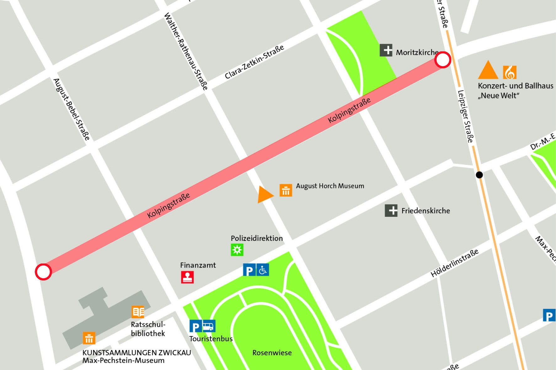 Ab Mittwoch, 23. Oktober 2019 ist die Kolpingstraße im Abschnitt zwischen Crimmitschauer und Leipziger Straße voll gesperrt. Dann startet die im Bau- und Verkehrsausschuss beschlossene Baumaßnahme zur Deckenerneuerung.