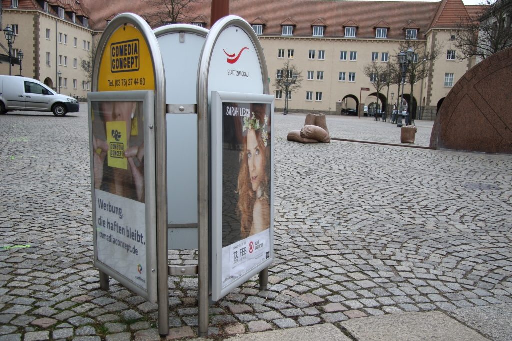 Diese Möglichkeit bietet der seit 2004 bestehende Werbenutzungsvertrag zwischen der Comedia Concept GmbH und der Stadt Zwickau. Die Planung und Genehmigung der Werbezeiträume wird vom Ordnungsamt koordiniert. Eine formlose Anmeldung ist jederzeit unter ordnungsamtzwickaude möglich. Der Plakataushang wird durch Comedia Concept organisiert.