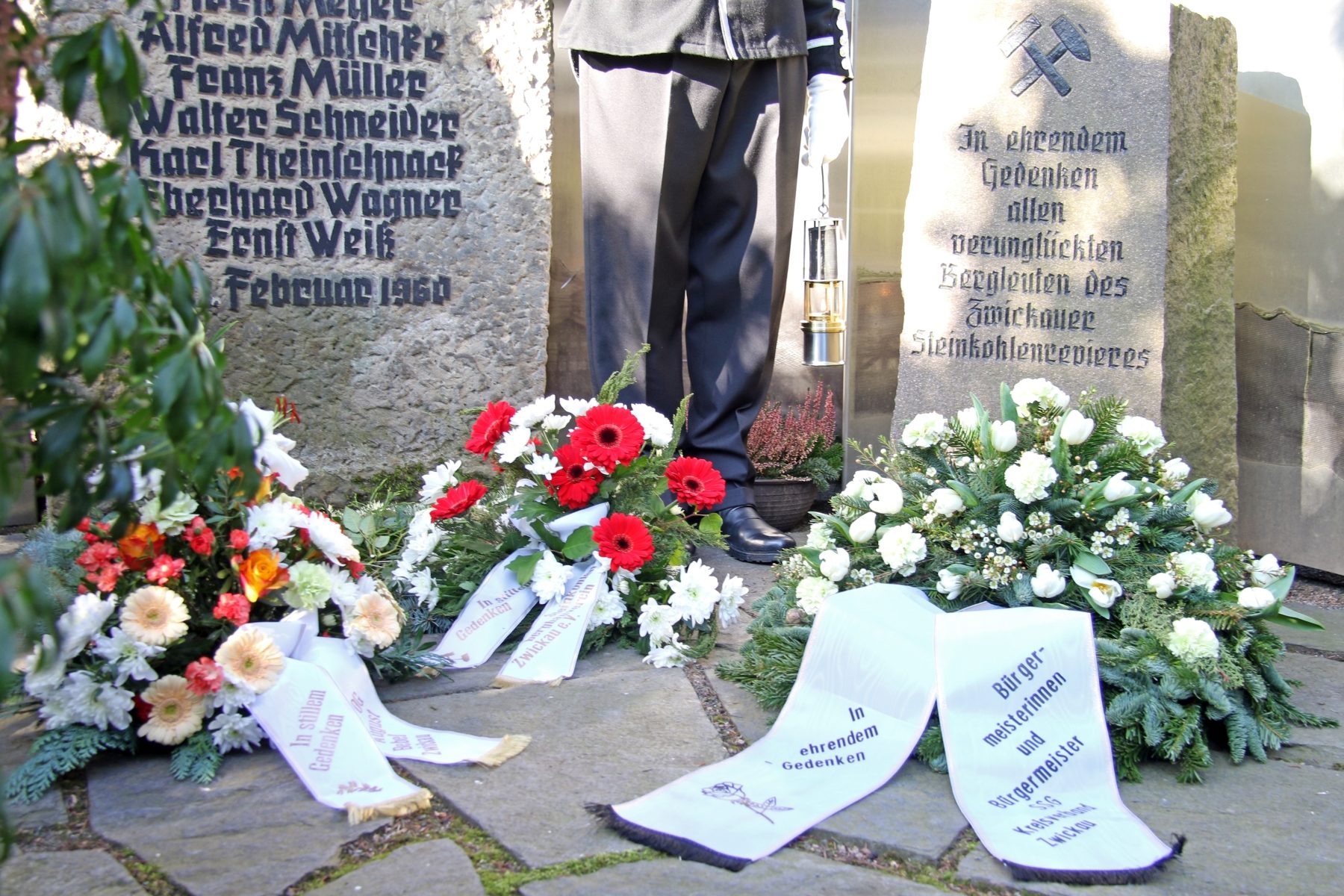 Bereits 1963 wurde in Erinnerung an diese Katastrophe die bergmännische Gedenkstätte auf dem Zwickauer Hauptfriedhof eingeweiht. Seit 1990 findet hier jährlich durch die Stadt und den Steinkohlebergbauverein das stille Gedenken statt. 2003 wurde ein weiterer Stein gesetzt, der an alle im Zwickauer Steinkohlerevier getöteten Bergleute erinnert. Aus Anlass des 45. Jahrestages der Einweihung der Gedenkstätte wurde diese schließlich um drei Edelstahlstelen erweitert. Auf diesen ist ein kurzer Text über die Ereignisse des Jahres 1960 sowie über weitere Grubenunglücke zu lesen. Anlässlich des 60. Jahrestages des schwersten Grubenunglücks in der Zwickauer Geschichte werden diese Edelstahltafeln nun durch neue ersetzt. Die Kosten trägt die Stadt Zwickau mit einem Zuschuss der Gemeinde Reinsdorf.