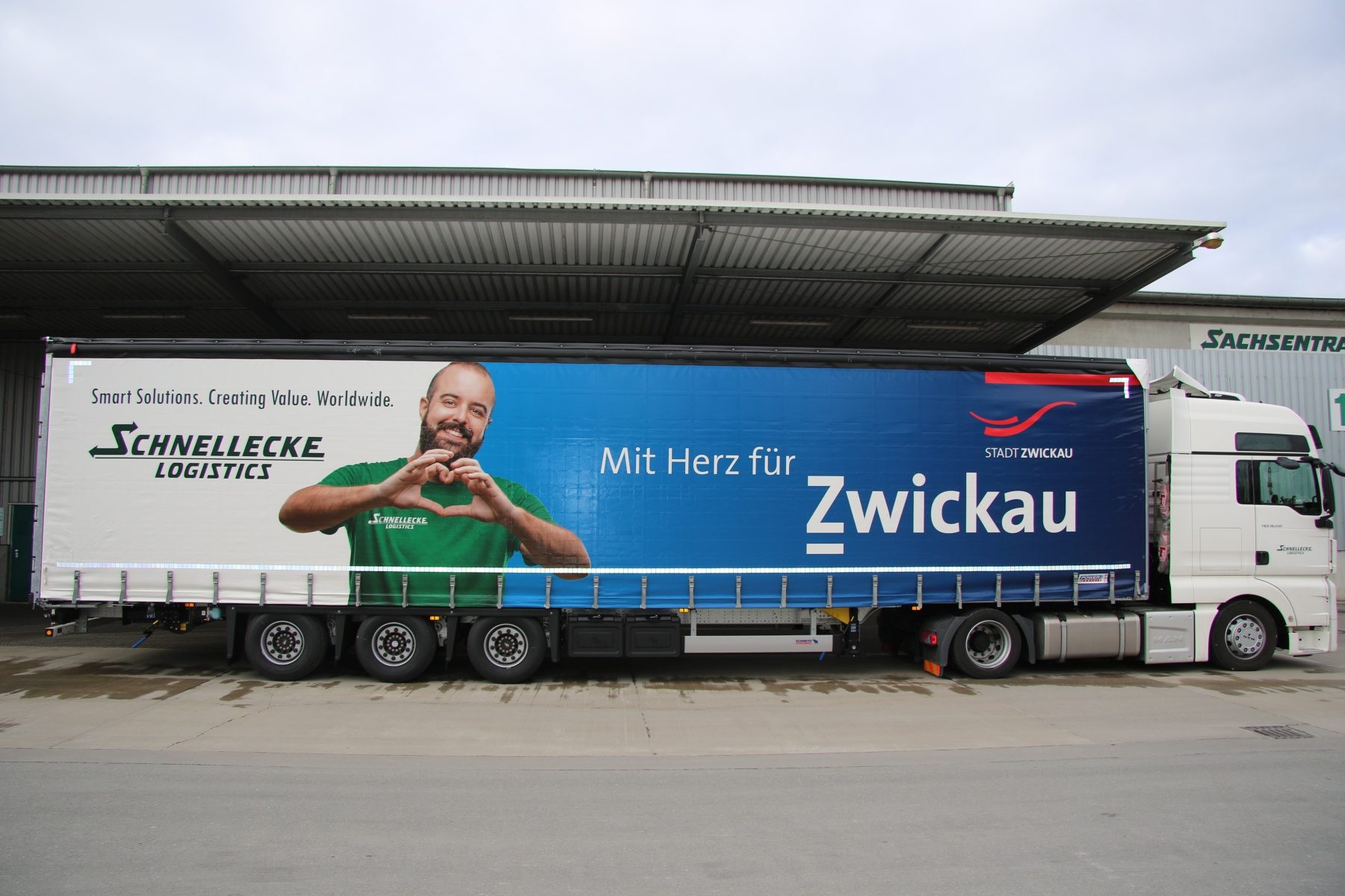 Ein lächelnder, bärtiger Kraftfahrer im moosgrünen T-Shirt formt mit seinen Händen ein Herz. Hinter ihm verbinden sich Arbeitgeber- und Standortfarben unter dem Slogan „Mit Herz für Zwickau“. Mehr als 13 Meter lang und 3 Meter hoch ziert dieser Aufdruck zehn neue Megatrailer der Sachsentrans Spedition und Logistik GmbH, die zum Dienstleistungsbereich Transportlogistik der weltweit agierenden Schnellecke Gruppe gehören.