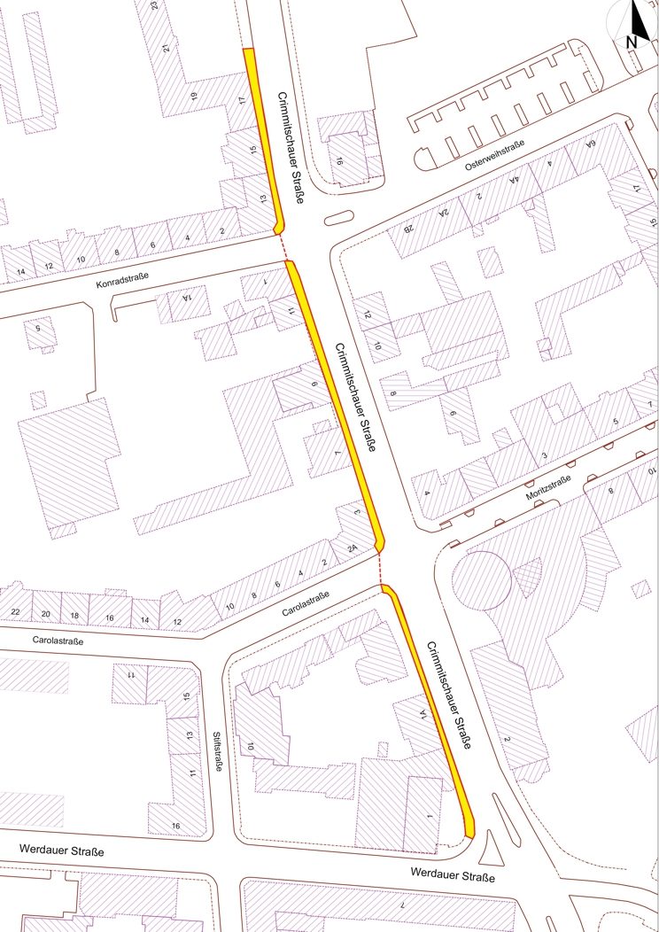 Der erste Abschnitt zwischen Werdauer Straße und Carolastraße erfolgt im Zuge der bereits durch die ZEV-Fernwärme gesperrten Rechtsabbiegespur von der Crimmitschauer Straße in die Werdauer Straße.