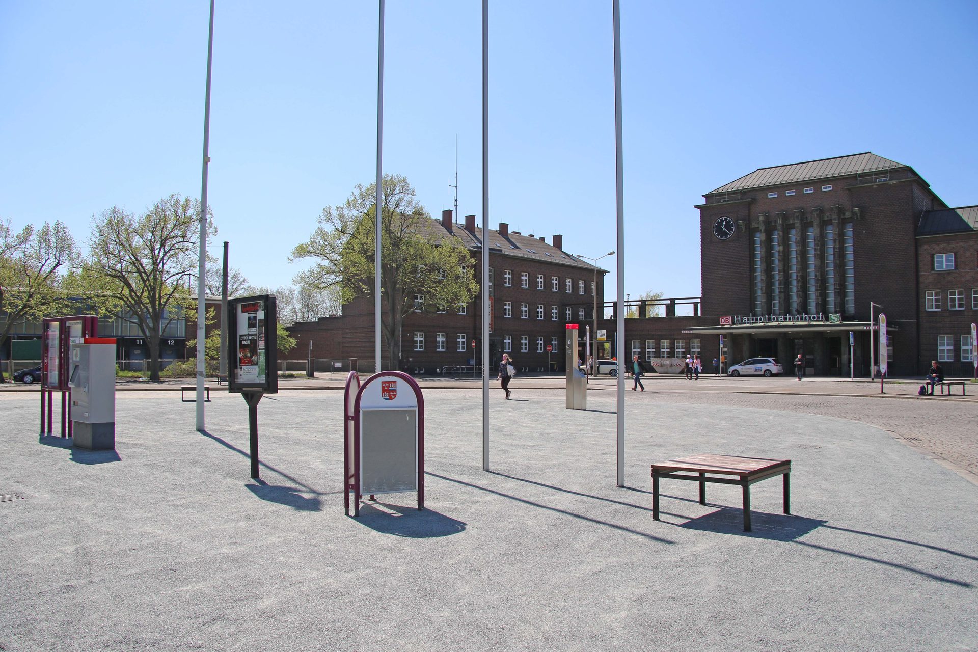 Das Garten- und Friedhofsamt hat im Rahmen der Aufwertungsmaßnahmen neue Bänke, Abfallbehälter und mobile Pflanzbehälter auf dem Bahnhofsvorplatz aufgestellt.