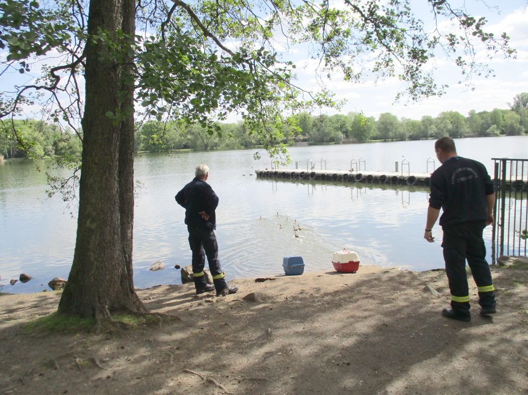 Die nun wieder vereinte Gänsefamilie wurde am Schwanenteich zu Wasser gelassen und hat den ungewöhnlichen Ausflug unbeschadet überstanden.