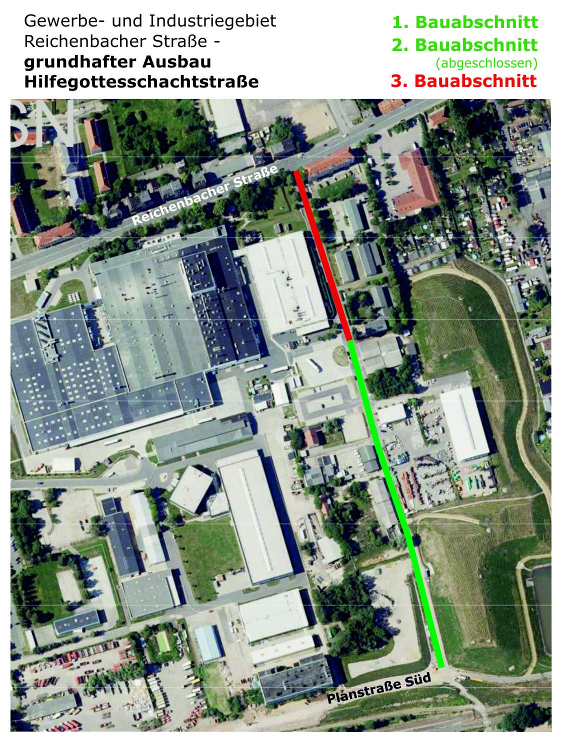 Die Bauarbeiten am Industrie- und Gewerbestandort Reichenbacher Straße sind seit März dieses Jahres wieder in vollem Gang. Nun ist der Bereich des 2. Bauabschnitts fast geschafft. In der kommenden Woche sind die Asphaltarbeiten vorgesehen. Ab 20. Juli werden die Nebenflächen hergestellt und Restarbeiten durchgeführt. Ab Montag, 27. Juli beginnt dann der Bau des letzten Abschnittes der Hilfegottesschachtstraße, der bis zur Reichenbacher Straße reicht.