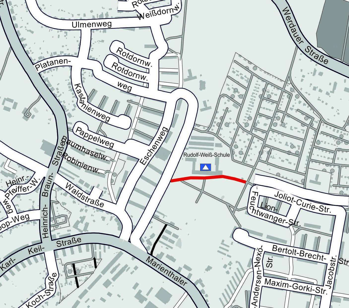 Der Geh- und Radweg vor der Rudolf-Weiß-Schule erhält auf einer Länge von ca. 265 Metern eine Asphaltdecke. Neu gestaltet wird auch eine Aufenthaltsfläche vor dem Eingang zur Schule. Diese erhält eine Betonsteinpflasterdecke. Ergänzt wird außerdem die Beleuchtungsanlage.
